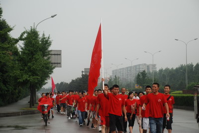 行軍途中,隊伍始終保持著(zhù)整齊的隊形和高昂的士氣,時(shí)而起步前進(jìn)、時(shí)而小跑行進(jìn)。雨一直在下,隊員們身上已分不清汗水與雨水。隨著(zhù)拉練距離的延伸,有的隊員開(kāi)始感到體力的困難。在風(fēng)中獵獵飄揚的團隊紅旗,回蕩在隊伍的上空的嘹亮歌聲,又不斷地激勵著(zhù)團隊的所有隊員克服一切的困難,向前,向前……