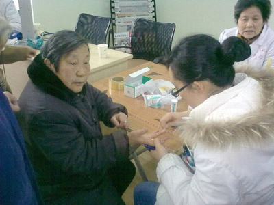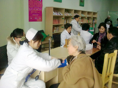 清晨,柳城誼苑客服中心的員工熱情的接待著(zhù)前來(lái)咨詢(xún)的為老爺爺、老奶奶,攙扶他們坐好,為他們端凳倒水;成都市老年病醫院派來(lái)了10余名醫務(wù)人員,在他們給醫生反映自己的身體情況后,醫務(wù)人員認真、仔細地為老人朋友們檢查身體的同時(shí),耐心的向他們解釋?zhuān)屆總€(gè)老人都真正的了解到自己的身體健康狀況。有的老年朋友還準備了筆記本,一一的記下醫生所說(shuō)的??障局?,醫務(wù)人員還和老人們聊起天來(lái)。