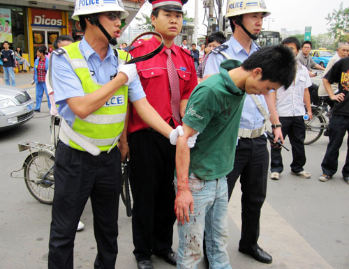 就在3分鐘前,這名渾身血跡的青年男子從天盛·壹中心停車(chē)場(chǎng)入口處花臺側沖進(jìn)了天盛壹中心,兩名警察在其身后緊追不舍,有人大叫“快抓住殺人犯”!此時(shí),天盛壹中心秩序維護部隊員正在小區廣場(chǎng)訓練,見(jiàn)狀立即圍追過(guò)去。一分鐘后,歹徒被圍堵在非機動(dòng)車(chē)輛停車(chē)場(chǎng)的綠化帶內,由于綠植枝葉茂盛,狡猾的歹徒仰臥在綠葉中,企圖借用自身的綠色T恤蒙蔽追捕,但還是被機警的秩序維護隊員彭發(fā)軍、王文澤發(fā)現。歹徒目露兇光,擺手示意秩序維護隊員不許伸張,但其囂張氣焰最終在步步緊逼的秩序維護隊員面前灰飛煙滅。情急之下他縱身翻過(guò)2米多高的圍墻逃到了小區后面的空地上。秩序維護主管鄭繼非帶著(zhù)耿磊、肖欣等幾十名隊員從“好又多”商鋪旁的小巷包抄過(guò)去,田維波緊跟歹徒身后,追至圍墻死角時(shí),兇惡的歹徒企圖作最后掙扎,最終還是被秩序維護班長(cháng)田維波制服,并與趕來(lái)的同事一道將其移交警方。
