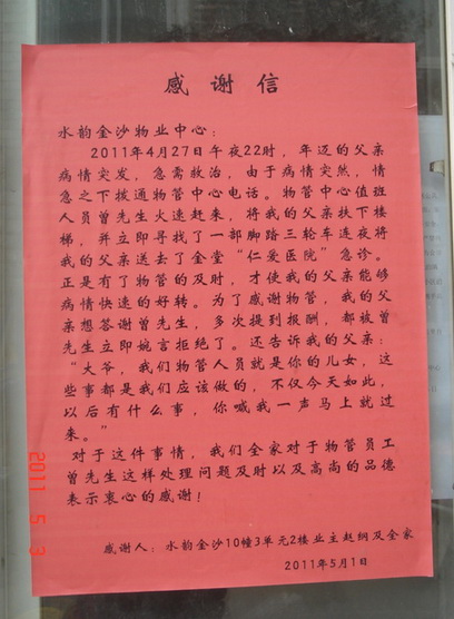 據了解,由金堂縣委、金堂縣人民政府主辦,金堂縣城鄉房管局承辦的“2011成都金堂城市榮譽(yù)盛典”于4月22日晚在縣政府廣場(chǎng)隆重舉行。成都市科恒置業(yè)顧問(wèn)有限公司等七家物業(yè)服務(wù)企業(yè)發(fā)楊“特別能吃苦、特別能戰斗、特別能奉獻”的精神,義務(wù)為盛典活動(dòng)提供保安人員無(wú)償進(jìn)行安保工作,確保了盛典活動(dòng)的安全、順利進(jìn)行。為樹(shù)立典范,表彰先進(jìn),經(jīng)縣房管局研究決定對7家物業(yè)服務(wù)企業(yè)表彰??h房管局希望受表彰的企業(yè)戒驕戒躁,發(fā)揚成績(jì),再接再厲,開(kāi)拓進(jìn)取,進(jìn)一步做好物業(yè)服務(wù)管理與服務(wù)工作,為構建和諧物管、宜居金堂和建設丘陵地區城鄉統籌示范縣城做出新的貢獻。
