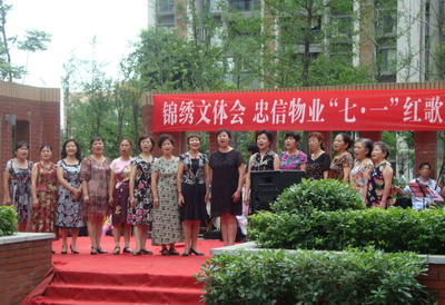 為迎接中國共產(chǎn)黨成立90周年,豐富小區文化生活,2011年6月22日下午,忠信物業(yè)“七·一”紅歌會(huì )在錦繡東方小區中心廣場(chǎng)拉開(kāi)帷幕。紅歌會(huì )由忠信服務(wù)中心與小區文體會(huì )聯(lián)合發(fā)起,成華區電視臺、跳蹬河街道辦、杉板橋社區等嘉賓應邀參加。