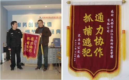 12月3日,經(jīng)過(guò)前期縝密偵查和艱苦的蹲點(diǎn)守候,安岳縣公安機關(guān)在??莆飿I(yè)所屬的某物管小區內抓獲1名網(wǎng)上通緝逃犯。安陽(yáng)岳縣公安機關(guān)在該小區偵察和蹲點(diǎn)守候期間,??莆锕芨鲘徫还ぷ魅藛T嚴守秘密,密切配合,在成功抓獲逃犯的過(guò)程中表現出了較好的專(zhuān)業(yè)素質(zhì)。為了感謝??莆锕芄竟ぷ魅藛T的支持與配合,安岳縣公安局有關(guān)領(lǐng)導專(zhuān)程到??莆锕芄举浰湾\旗和感謝信以示警民協(xié)作的謝意。