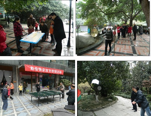 我公司組織了10多項業(yè)主游園活動(dòng)游戲?;顒?dòng)當日,小區業(yè)主扶老攜幼積極參與,共同分享一場(chǎng)豐富的社區文化盛宴?!安轮i”這邊迷友冥思苦想;“蒙面敲鑼”那邊歡聲笑語(yǔ)不斷;“下象棋”人們鼓足腮幫;“打乒乓”現場(chǎng)熱情似火;“擲飛鏢”大家一絲不茍,抽獎活動(dòng)更是把節日氣氛推向了高潮,豐富的游戲使現場(chǎng)的節日氣氛格外喜慶、熱烈。