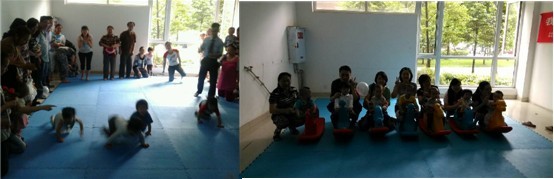 此次活動(dòng)共策劃了寶寶爬行比賽、跟我說(shuō)英語(yǔ)、巧手畫(huà)童年三個(gè)項目。孩子們高興地唱著(zhù)、跳著(zhù)、盡情地享受著(zhù)節日的快樂(lè )。上午九時(shí),活動(dòng)正式開(kāi)始:瞧,爬行墊上那個(gè)小乖乖,怎么了?還沒(méi)到終點(diǎn)怎么就不繼續前行了呢?累了?困了?噢,原來(lái)是尿尿了!這邊“跟我說(shuō)英語(yǔ)”小組的小朋友們在咿咿哇哇地唱著(zhù)英語(yǔ)兒歌;那邊畫(huà)畫(huà)的孩子們在潔白的氣球上、畫(huà)紙上涂抹著(zhù)童年的夢(mèng)想……