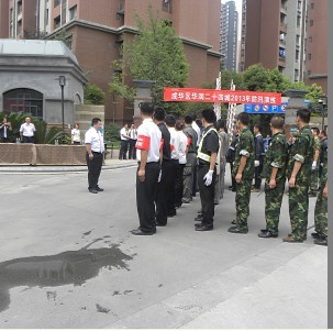 此次演習誠邀成華區政府領(lǐng)導、成華區房管局物管科領(lǐng)導、公司蒲總以及成華區物業(yè)同行近200人到場(chǎng)參觀(guān),本次演習總指揮由一期項目蘇經(jīng)理?yè)?,共設立:聯(lián)絡(luò )組、客戶(hù)組、工程組、搶險組、抽排組等8個(gè)小組。經(jīng)過(guò)精密的安排部署,28日下午15:00演習正式開(kāi)始。參觀(guān)人員被參演人員熱情飽滿(mǎn)的精神面貌,列隊后整齊一致的團隊形象深深的震撼。在蘇經(jīng)理的指揮下,各小組成員迅速到達指定地點(diǎn),開(kāi)始行動(dòng),客戶(hù)部負責通知地下車(chē)庫車(chē)主將車(chē)輛移出;工程部負責檢查水泵排水情;搶險組負責現場(chǎng)搶險、疏導車(chē)輛交通、警戒現場(chǎng)……一切都有條不紊的進(jìn)行。隨著(zhù)一聲“報告總指揮車(chē)輛已經(jīng)疏散完畢,現場(chǎng)汛情已經(jīng)排除,園區設備總體完好,無(wú)電梯受損,無(wú)人員受傷,現場(chǎng)秩序井然。車(chē)輛疏散完畢,無(wú)車(chē)輛受損。是否可以結束搶險,請您指示!”宣告本次演習順利結束。其后市房管局唐主任對此次演習進(jìn)行了點(diǎn)評和表?yè)P。