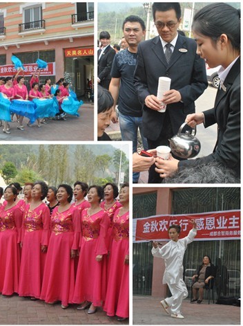 2013年10月11日合智商務(wù)組織麗都玉園、麗都花園城外側、彭州丹郡項目在彭州白鹿鎮舉行“金秋歡樂(lè )行,感恩業(yè)主情”重陽(yáng)節秋游活動(dòng)。