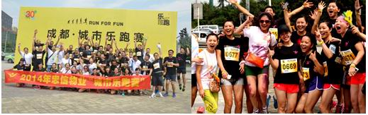 2014年9月12日下午,溫江國際非遺博覽園內人聲鼎沸,來(lái)自成都各領(lǐng)域的120多家企事業(yè)單位近萬(wàn)人歡聚在此,共同參與“成都·城市樂(lè )跑賽”活動(dòng)。忠信物業(yè)團隊共派出35名選手和20名拉拉隊員參賽助陣,大家身著(zhù)統一印有忠信LOGO、“as fun as you can”圖案標語(yǔ)的隊服,歡笑的臉上繪著(zhù)彩色圖案,身上和隊服上噴灑著(zhù)炫麗的色彩,以飽滿(mǎn)的精神出現在活動(dòng)現場(chǎng),引來(lái)了各團隊及媒體的關(guān)注。