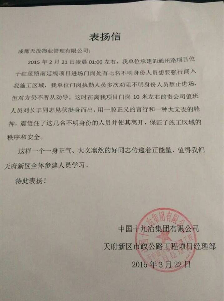 時(shí)間定格在2015年2月21日凌晨1:00左右,由中國十九冶集團有限公司天府新區市政公路工程項目經(jīng)理部承建的通州路項目,位于紅星路南延線(xiàn)項目進(jìn)場(chǎng)門(mén)崗處,突然出現七名不明身份人員試圖強行闖入工作。此時(shí),工地執勤人員進(jìn)行勸阻無(wú)過(guò),人員即將強行進(jìn)入時(shí),離項目崗10米處的秩序維護員劉長(cháng)豐同志挺身而出,以一腔正義的言行和一種大無(wú)畏的精神震懾住外來(lái)人員,并通過(guò)啟動(dòng)應急預案使其離開(kāi)。