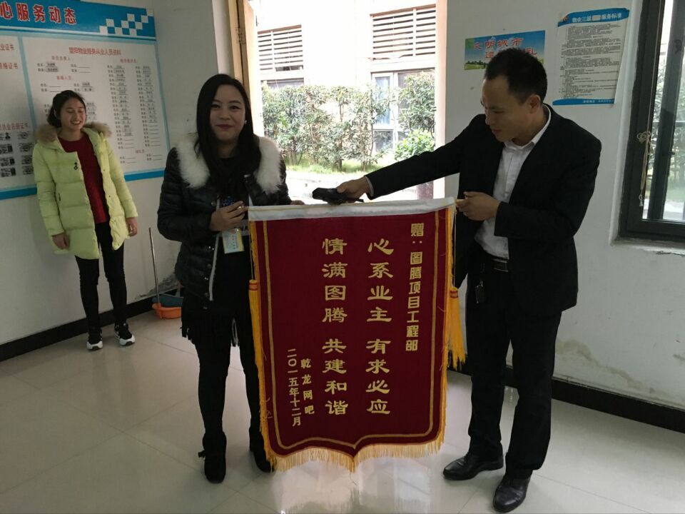 2015年12月2日剛到上班時(shí)間,圖騰國際商業(yè)中心乾隆網(wǎng)吧店主就來(lái)到望陽(yáng)物業(yè)圖騰國際客服中心,將一面寫(xiě)有“心系業(yè)主,有求必應,情滿(mǎn)圖騰,共建和諧”的大紅錦旗贈送到客服中心工程部經(jīng)理手中,并由衷的說(shuō)到:感謝你們不怕臟,不怕臭,及時(shí)為我們解決了衛生間滲漏水的難題,真是太感謝了!