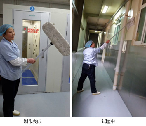 項目中心的服務(wù)對象是食品生產(chǎn)企業(yè),對全廠(chǎng)內外的環(huán)境衛生安全要求十分嚴格,特別是生產(chǎn)車(chē)間內部的衛生標準更是苛刻。根據生產(chǎn)要求,工作人員需要經(jīng)常對車(chē)間內外的地面、墻體、門(mén)窗開(kāi)展清潔消毒工作。按照傳統的方法,使用拖帕清潔,需要反復好幾次才能去除污漬和痕跡,干燥工作,勞動(dòng)強度很大,效率極低。為解決這個(gè)難題,保潔人員在項目肖經(jīng)理的帶領(lǐng)導下,魏英、周進(jìn)、周成聰等同志經(jīng)過(guò)幾天幾夜的艱苦“攻關(guān)”,想到利用廢棄的塵推架子,重新改造了這個(gè)小工具。改造后的“新型”工具利用海綿吸水保濕的特點(diǎn),能夠高效、一次性地完成對地面、墻體、門(mén)窗的除污、去痕和干燥。