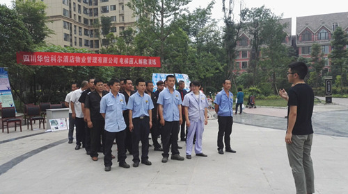 在電梯困人演練開(kāi)始前,奧的斯電梯廠(chǎng)家龍泉片區負責人就電梯日常維護和乘坐的注意事項及電梯相關(guān)知識做了詳細講解,強調了在電梯發(fā)生停電、超載、在轎廂內蹦跳、電梯門(mén)關(guān)合故障的情況時(shí)的正確應對方法。物業(yè)工程部負責人胡成武按照物業(yè)公司的應急預案流程對參與演練人員做了現場(chǎng)培訓和分工。