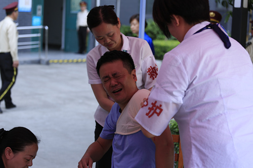 第二階段:搜救救護。該階段分四個(gè)步驟進(jìn)行。第一,搜救組進(jìn)入建筑物進(jìn)行搜救。第二,利用擔架和輪椅將搜救組搜救到的一名頭部受傷并昏迷的業(yè)主與一名肩部腿部受傷的業(yè)主輸送至中庭的救護站。第三,在救護站,救護組對頭部受傷昏迷的業(yè)主實(shí)施心肺復蘇搶救及傷口包扎,對肩部腿部受傷的業(yè)主實(shí)施傷口包扎。第四,救護組將已初步脫離生命危險的業(yè)主攙扶上應急救護車(chē),隨即送往醫院進(jìn)行后續治療。