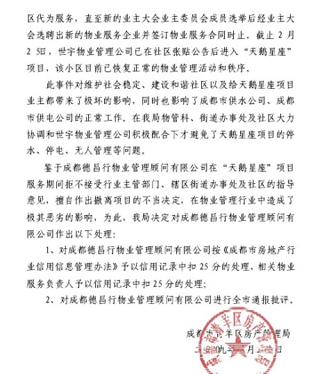 上一條:關(guān)于對鑫天禹物業(yè)管理有限公司涉及中鐵雙龍灣項目“賣(mài)口子”事件處理情況的通報 下一條:成都市物業(yè)管理協(xié)會(huì )關(guān)于開(kāi)展第三屆“誠信入戶(hù)、和諧物管、共建家園”活動(dòng)的通知