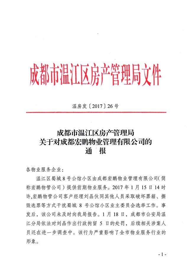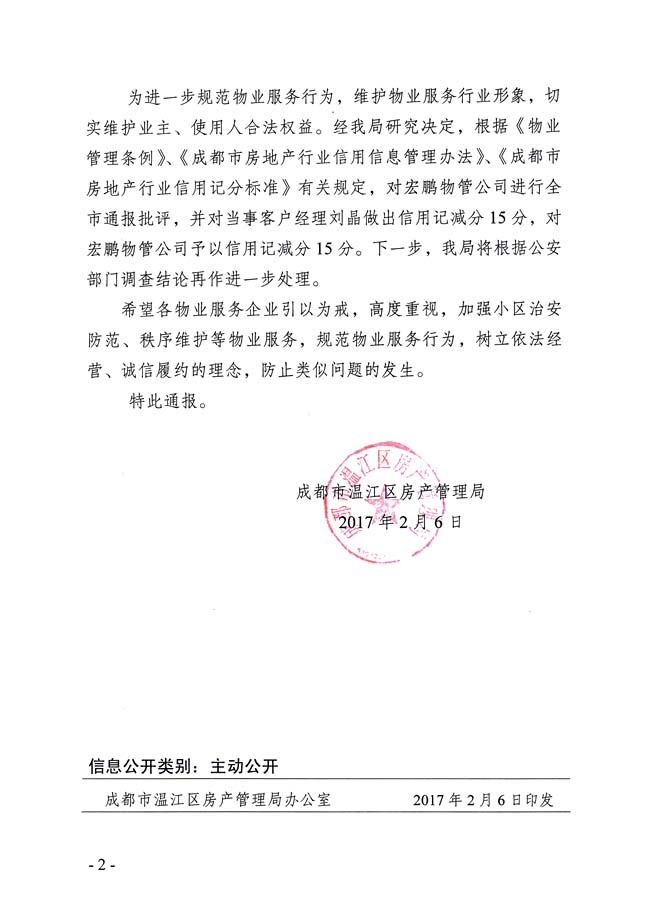 關(guān)于對成都宏鵬物業(yè)管理有限公司的通報