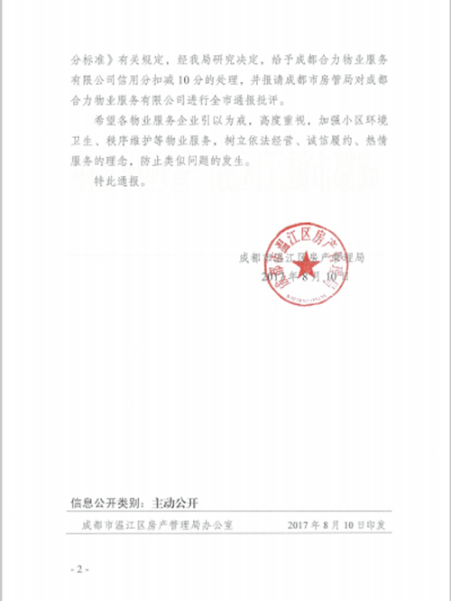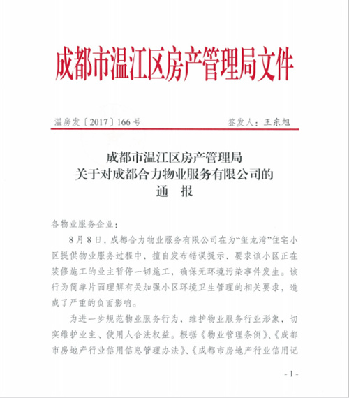 成都市溫江區房產(chǎn)管理局關(guān)于對成都合力物業(yè)服務(wù)有限公司的通報