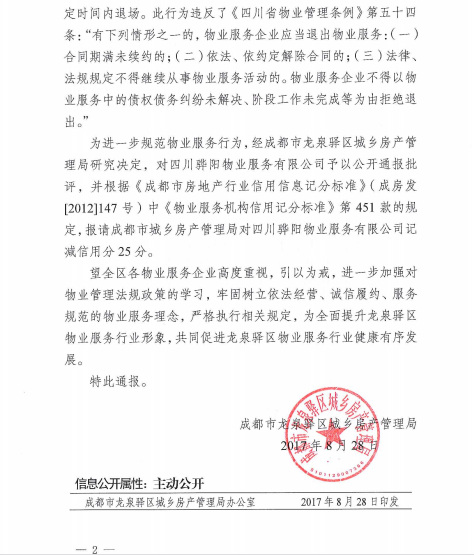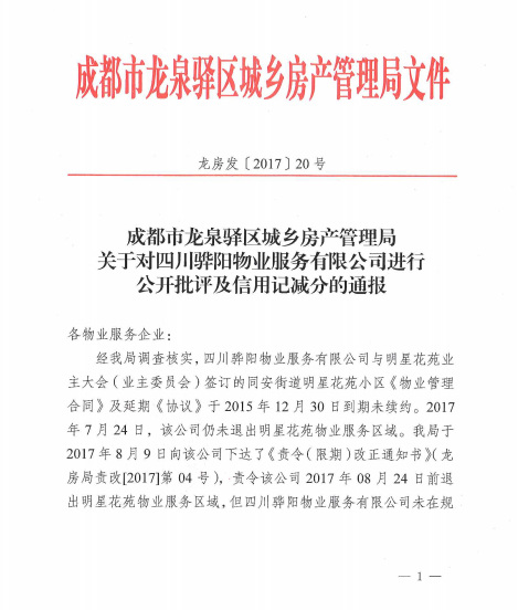 成都市龍泉驛區城鄉房產(chǎn)管理局關(guān)于對四川驊陽(yáng)物業(yè)服務(wù)有限公司進(jìn)行公開(kāi)批評及信用減分的通報