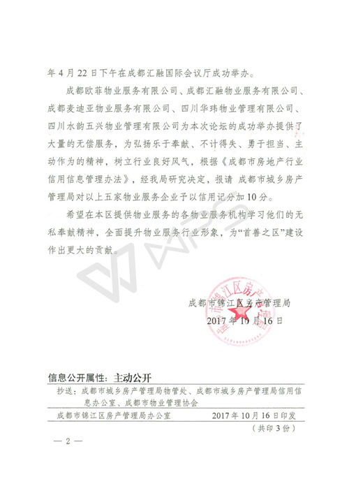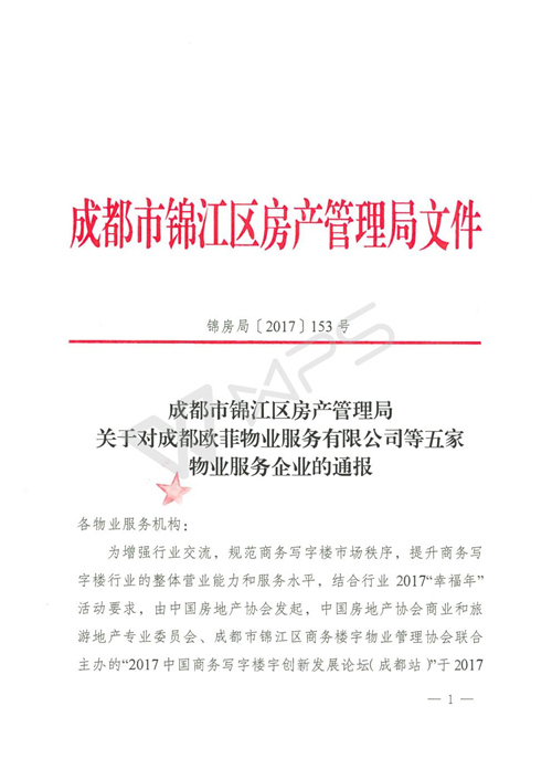 成都市錦江區房產(chǎn)管理局關(guān)于對成都歐菲物業(yè)服務(wù)有限公司等五家物業(yè)服務(wù)企業(yè)的通報