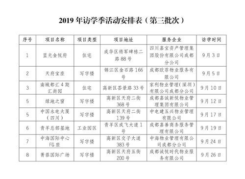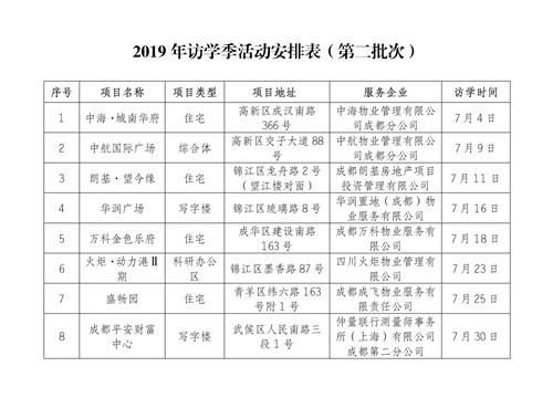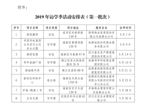 為加快推動(dòng)我市物業(yè)服務(wù)行業(yè)高質(zhì)量發(fā)展,充分發(fā)揮首批成都市物業(yè)服務(wù)標準化示范項目的示范、引領(lǐng)、輻射作用,促進(jìn)物業(yè)服務(wù)先進(jìn)經(jīng)驗和創(chuàng )新做法的廣泛交流學(xué)習,協(xié)會(huì )定于5月至9月分三批次組織開(kāi)展物業(yè)服務(wù)標準化示范項目“訪(fǎng)學(xué)季”活動(dòng),現將有關(guān)事項通知如下:
