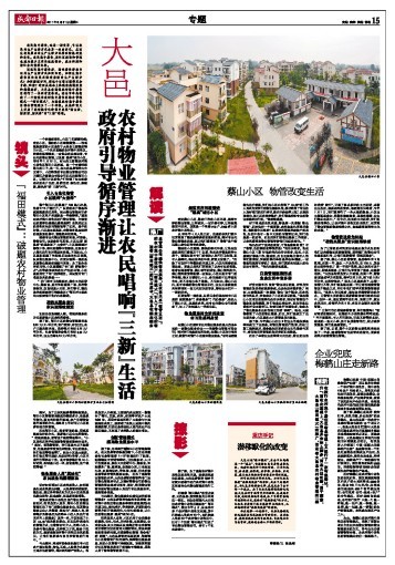 而農民集中居住后,新的居住形態(tài)與舊的生產(chǎn)生活方式如何匹配,如何讓集中居住區的農民盡快適應新的生產(chǎn)生活方式?如何縮短時(shí)間,使這個(gè)過(guò)程過(guò)渡得更加自然、和諧?進(jìn)而從根本上體現出規模效益和規模經(jīng)濟,大邑縣在新型農村集中居住區進(jìn)行了一系列有益嘗試。在全市率先創(chuàng )建了一個(gè)新型的農村集中居住區綜合管理模式--“福田模式”,為新型農村集中居住區綜合管理建立了一個(gè)樣板。從某種意義上開(kāi)啟了農村城市化進(jìn)程中農民“新生活、新家園、新風(fēng)尚”的“三新”進(jìn)程。