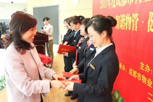 成都市物業(yè)管理協(xié)會(huì )副會(huì )長(cháng)梁古芬為獲獎人員頒獎