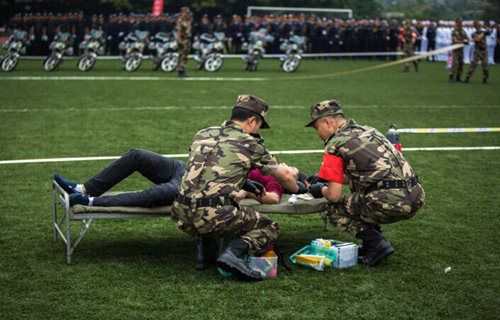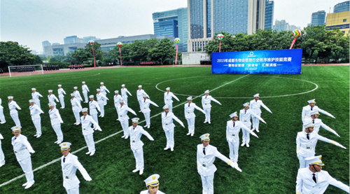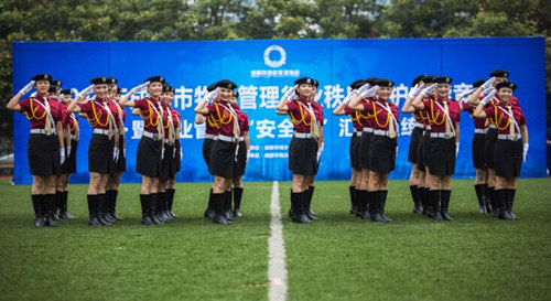 10月17日下午,由成都市物業(yè)管理協(xié)會(huì )主辦的2015年成都市物業(yè)管理行業(yè)秩序維護技能競賽暨物業(yè)管理“安全年”匯報演練活動(dòng)在成都職業(yè)技術(shù)學(xué)院盛大舉行。來(lái)自成都市物業(yè)管理行業(yè)的17支企業(yè)代表隊和近千名物業(yè)服務(wù)人員參加了本次競賽和匯報演練。成都市城鄉房產(chǎn)管理局物業(yè)管理處副處長(cháng)姜魯東、調研員唐宗偉,成都市成華區房產(chǎn)管理局副調研員傳光全受邀出席活動(dòng)。成都市物業(yè)管理協(xié)會(huì )會(huì )長(cháng)聞濤,副會(huì )長(cháng)溫文遐、陳干平、田永云、李軼梅、梁古芬、杜小云、曹毅、李立新,秘書(shū)長(cháng)巫慶敏等領(lǐng)導出席活動(dòng)。競賽評委由唐宗偉調研員、傳光全副調研員、溫文遐副會(huì )長(cháng),以及特邀嘉賓四川時(shí)尚職業(yè)培訓學(xué)校副校長(cháng)賓冰,成都市公安局交通管理局第一分局警官趙亮華擔任。