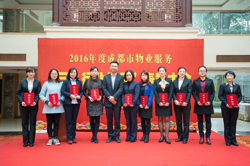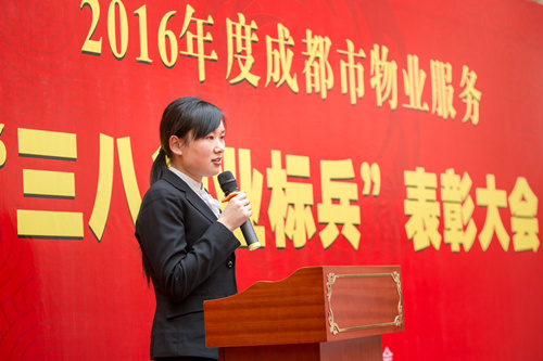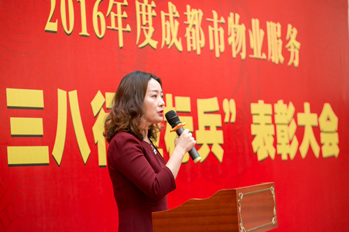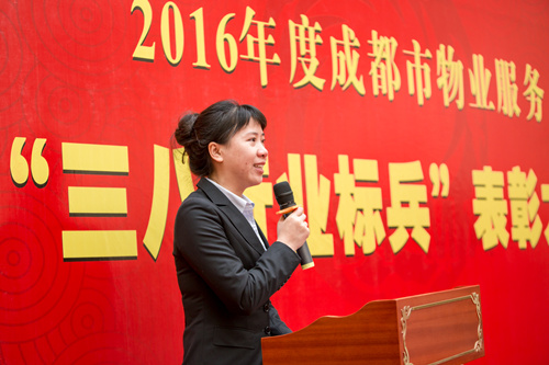 成都市物業(yè)管理協(xié)會(huì )常務(wù)副會(huì )長(cháng)、秘書(shū)長(cháng)巫慶敏為標兵頒獎
