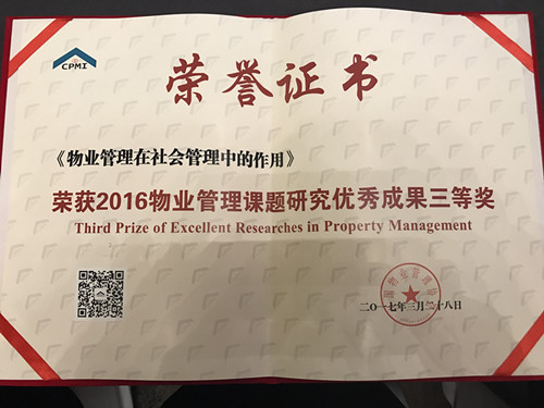 4月6日,中國物業(yè)管理協(xié)會(huì )第四屆理事會(huì )第四次全體會(huì )員召開(kāi).會(huì )議對2016年度物業(yè)管理課題研究?jì)?yōu)秀成果進(jìn)行了表彰,我會(huì )提交的《物業(yè)管理在社會(huì )管理中的作用》課題榮獲“2016全國物業(yè)管理課題研究?jì)?yōu)秀成果三等獎”殊榮。