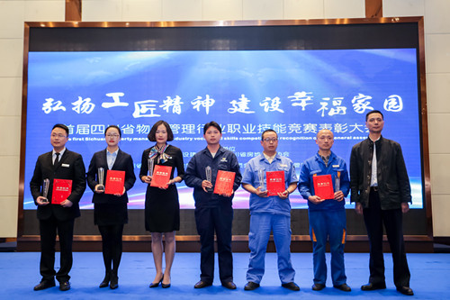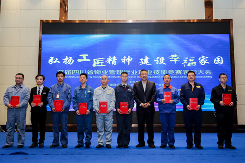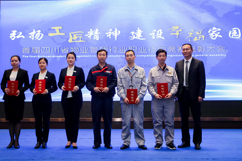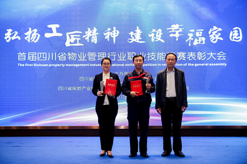四川省房地產(chǎn)業(yè)協(xié)會(huì )物業(yè)管理專(zhuān)業(yè)委員會(huì )主任姚敏為“技術(shù)標兵”獲獎選手頒獎