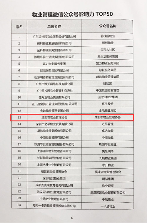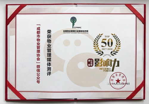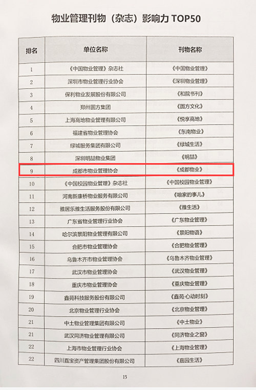 同時(shí)入圍物業(yè)管理微信公眾號影響力TOP50的成都物業(yè)企業(yè)微信公眾號有“嘉寶股份”“蜀信物業(yè)”“成都金房物業(yè)集團”“成都華昌物業(yè)”;入圍物業(yè)管理刊物影響力TOP50的成都物業(yè)企業(yè)刊物有《嘉園生活》、《艾明之聲》。
